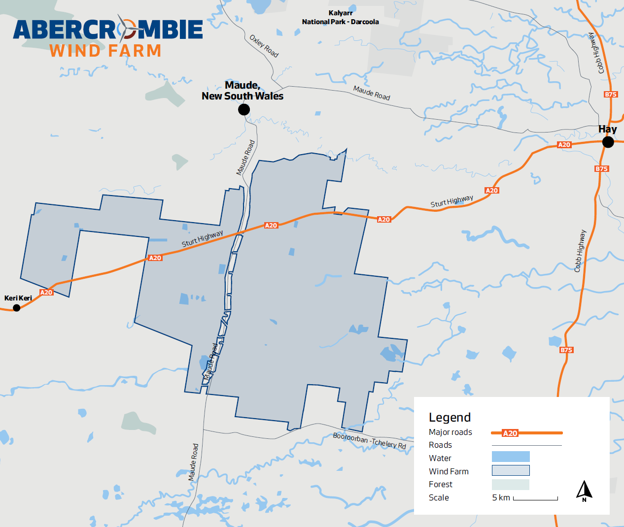 The proposed Abercrombie Wind Farm project boundary is approx. 40km west of Hay, in the South West Renewable Energy Zone (SW REZ).